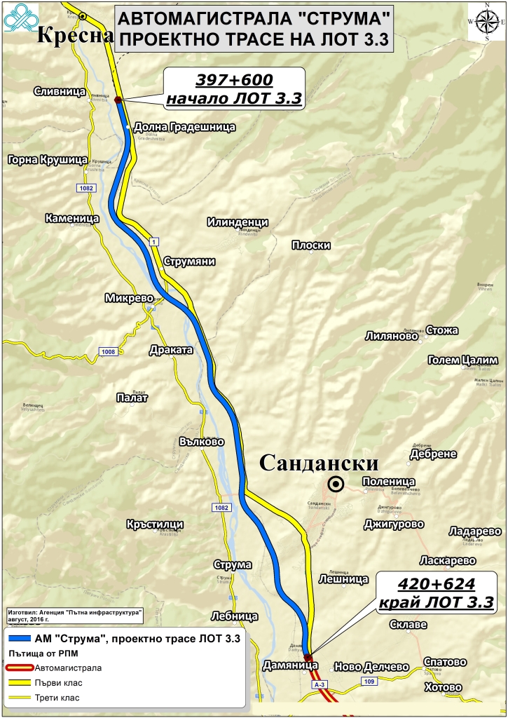 The section from Kresna to Sandanski is part of Lot 3 Blagoevgrad – Sandanski. It is divided into three subsections – Lot 3.1 from Blagoevgrad to Krupnik, Lot 3.2 between Krupnik and Kresna and Lot 3.3 from Kresna to Sandanski.